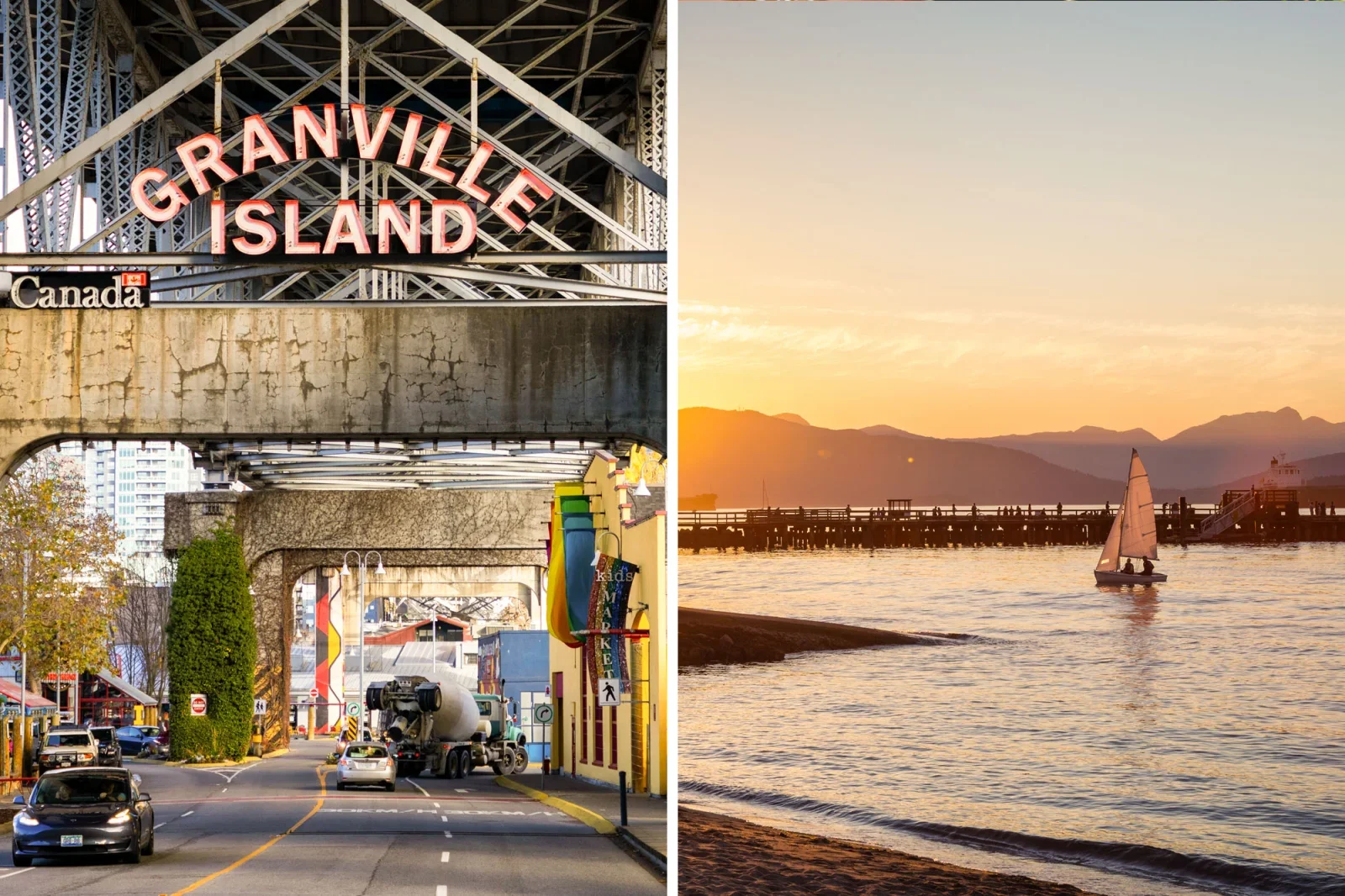 After a day at the industrial-chic Granville Island market, watch the sunset on Jericho Beach. Photo by Chad Montgomery/Unsplash (L); photo by EB Adventure Photography/Shutterstock (R)